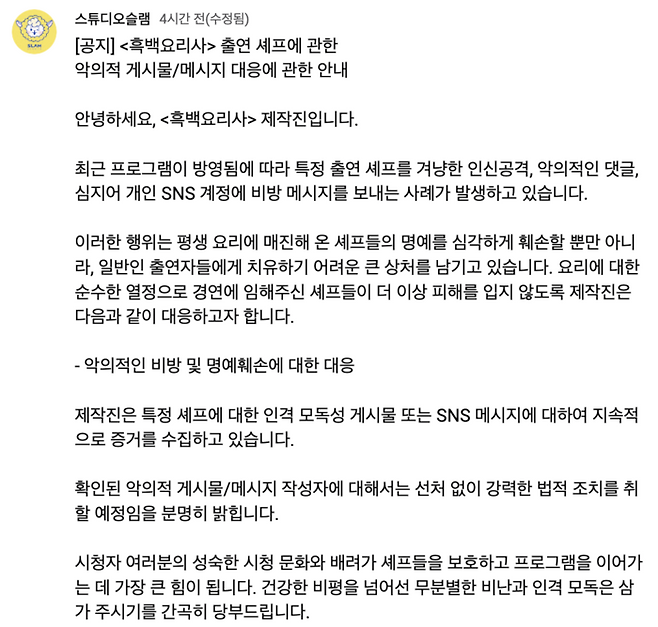 '흑백요리사2'의 제작사 스튜디오 슬램은 6일 공식 입장을 통해 특정 출연 셰프를 겨냥한 인신공격과 악성 댓글, SNS 비방 메시지에 대해 강력한 법적 대응을 시사했다.