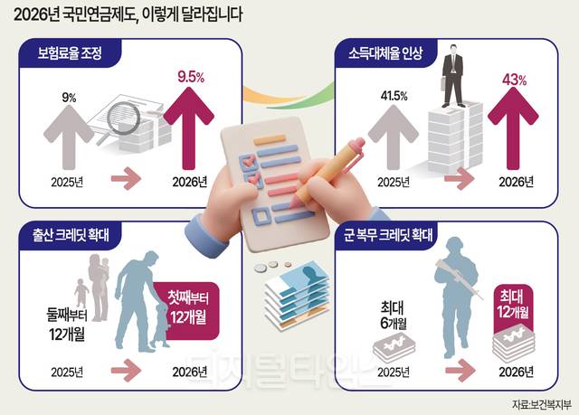 지속 가능한 국민연금 제도를 목표로 한 ‘연금개혁’이 18년 만에 이뤄지면서 올해부터 제도가 달라진다. 보험료율과 소득대체율 인상, 크레딧 제도 확대와 저소득 지역가입자 보험료 지원 강화가 동시에 추진된다.