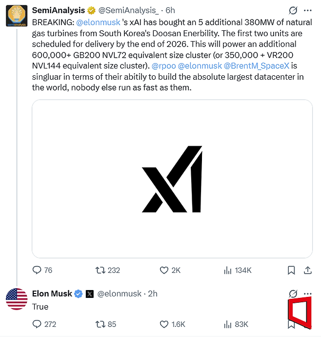 머스크는 5일(현지시간) 엑스(X·옛 트위터)에서 "xAI가 한국 두산에너빌리티로부터 380㎿(메가와트)급 천연가스 가스터빈을 추가 구매했다"는 미국 시장조사업체 세미애널리시스(SemiAnalysis) 게시글에 "True(사실이다)"라고 답글을 남겼다. 해당 게시글에 따르면 xAI는 두산에너빌리티의 380㎿급 가스터빈 5기를 구매했고 이 중 2기는 2026년 말까지 인도될 예정이다.