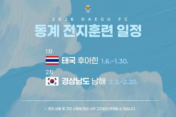 6일 대구는 태국 후아힌으로 출국해 2026시즌을 대비한 본격적인 동계 전지훈련에 돌입한다. 이번 전지훈련은 1월 6일부터 30일까지 태국 후아힌에서 실시되며, 선수단은 체력 강화와 전술 완성도 향상에 중점을 두고 시즌 준비의 기초를 다질 예정이다. 따뜻한 기후와 안정적인 훈련 환경을 갖춘 태국 후아힌은 선수들이 훈련에만 온전히 집중할 수 있는 최적의 장소로 평가받는다.