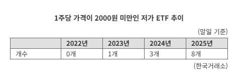 1주당 가격이 2000원 미만인 저가 ETF 수도 불어났다. 2022년 저가 ETF는 전무했지만, 2023년 1개, 2024년 3개에서 지난해 8개로 늘었다. 이중 4개 상품은 모두 인버스 ETF로, 1주당 가격이 1000원에도 못 미치는 동전주다.