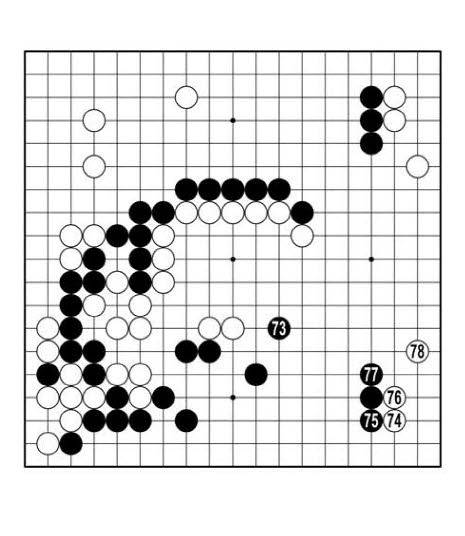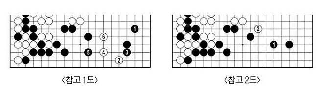 흑73을 두자 백74로 귀로 들어갔다. <참고 1도> 흑1 날일자면 귀를 가질 수 있지만 백이 아래쪽에서 활개를 친다. <참고 2도> 흑1로 한 칸 뛰면 아래쪽도 지키고 귀도 쉽게 빼앗기지 않지만 백2로 가운데를 굳히고 넓히는 수가 빛났다.