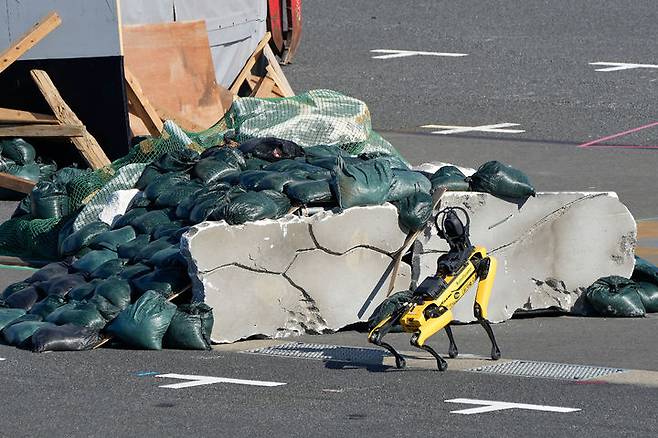 지진 현장 수색 시범 보이는 4족 보행 로봇