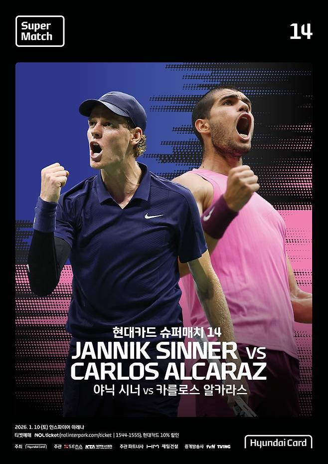 알카라스와 시너는 9일(금) 오후3시 현대카드 본사에서 공식 기자회견 및 웰컴 이벤트에 참여하고, 10일(토) 오후4시부터 영종도 인스파이어 아레나에서 슈퍼매치를 갖는다. 본 경기에 앞서 오후2시부터는 정연수(명지대 입학예정)와 고민호(한국체대 입학예정)의 사전 경기도 치러진다.