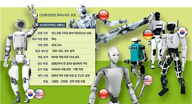 국내외에서 가장 잘 알려진 중국 로봇 기업 유니트리는 물론이고 매직랩, 엔진AI, 로보테라 등이 부스를 내고 CES에 참여했다. 미국을 대표해서는 아마존 물류센터에서 일하고 있는 어질리티로보틱스의 ‘디짓’과 독일 기업 뉴라로보틱스의 ‘4NE1’ 등이 등장했다. 한국 로봇 기업으로는 홈로봇을 공개한 LG전자 외에도 젠슨 황 엔비디아 최고경영자 특별연설에 등장한 에이로봇의 앨리스4가 참여했다. 한국 기업들은 K휴머노이드 얼라이언스라는 이름으로 공동 부스를 냈다.