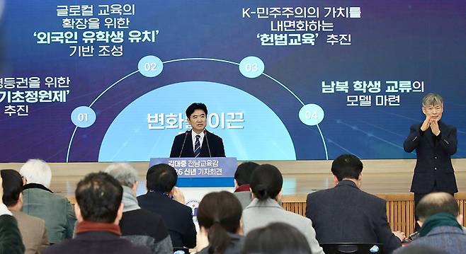 김대중 도교육감은 6일 오전 청사 대회의실에서 신년 기자회견을 갖고 2026년 주요 정책 추진 방향을 밝혔다.<사진>
