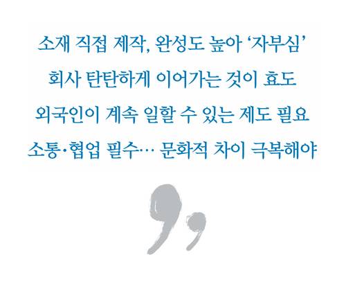 제도의 개선과 더불어 산업 현장에서 일하는 외국인들에 대한 시선도 바뀌어야 한다는 게 이 대표의 생각이다. 삼성엔지니어링 재직 당시 해외 여러 국가에서 일하면서 다양한 국적의 사람들을 만나본 그가 느끼기에 한국의 인종차별은 상당히 심각한 편이다. 앞으로 국내 뿌리산업 현장에서 숙련된 기술을 가진 외국인들이 중간 관리자 역할을 맡는 사례가 늘어날 텐데, 이 과정에서 한국인과 외국인 직원을 어떻게 문화적으로 융합할지가 과제다.