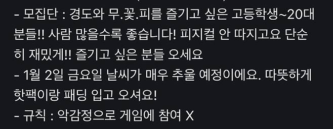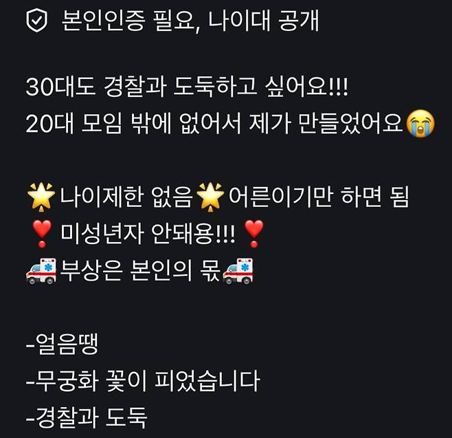 "동네마다 다르고, 경찰 도둑 구분하는 것도 모임마다 달라. 나이도 17세 이상도 있었고, 미성년자는 안된다는 방도 있었고, 만나는 시간대도 모집하는 방마다 달라. 약간 번개모임 같은 거라서 정해진 게 없어. 근데 우리가 한 경도는 17세 이상. 8시 이후 동네 공원이었어."