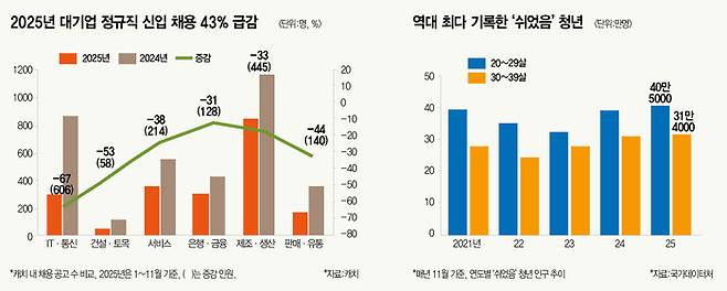 채용 플랫폼 캐치가 2025년 1~11월 대기업 정규직 신입 채용 공고를 비교 분석한 결과에 따르면, 올해 공고 수는 2145건으로 2024년 같은 기간(3741건)보다 43% 줄었다. 같은 기간 인턴·계약직을 포함한 대기업 전체 신입 채용 공고 역시 34% 줄었다. 청년 일자리 3분의 1이 사라진 셈이다. 경기 침체로 기업 채용 심리가 위축됐고, 경력직 중심 채용 관행이 굳어진 데다, 대규모 일자리를 공급했던 제조업 부진 등이 영향을 미쳤다. 2025년 초 한국경영자총협회가 전국 100인 이상 기업 500개사를 대상으로 실시한 ‘2025년 신규 채용 실태조사’ 결과에 따르면 응답 기업의 60.8%만이 신규 채용 계획이 있다고 답했다. 채용을 확대하겠다는 응답은 13%에 그쳤다.