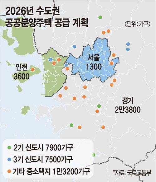 지역별로는 서울 1300가구, 인천 3600가구, 경기 2만3800가구다. 택지지구별로는 조성이 한창인 수도권 3기 신도시에서 7500가구, 2기 신도시에서 7900가구를 공급한다. 수도권 내 중소택지에서도 1만3200가구가 분양에 나선다.