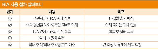 사용법은 단순하다. ① 먼저 증권사에서 RIA 계좌를 개설한다. RIA 계좌 출시 시점은 1월 말~2월 초로 예상된다. ② 기존 해외 주식 계좌에 있던 종목 가운데 수익 실현을 원하는 종목만 이 계좌로 옮긴다. 이체만으로는 세금이 발생하지 않는다. ③ RIA 계좌 안에서 해당 해외 주식을 매도한 뒤 달러를 원화로 환전한다. ④ 이후 국내 주식이나 국내 주식형 펀드를 매수한다.