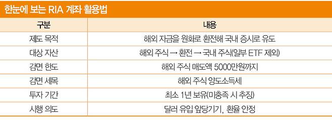 주의할 점도 있다. ‘최소 1년’이라는 시간 제약이다. RIA 계좌 속 자금은 1년 이상 국내 증시에 투자해야 세제 혜택이 확정된다. 매수와 매도 사이에 기간이 얼마까지 벌어져도 되는지 등 세부 사항은 조율 중이다.