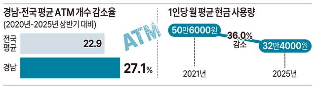 금융감독원에 따르면 2020년 3만3707개였던 전국 ATM은 지난해 상반기 기준 2만5987개로 5년 사이 7720개(22.9%) 감소했다. 경남은 27.1% 감소해 울산(28.4%), 경북(27.3%)에 이어 전국에서 세 번째로 감소율이 높았다.
