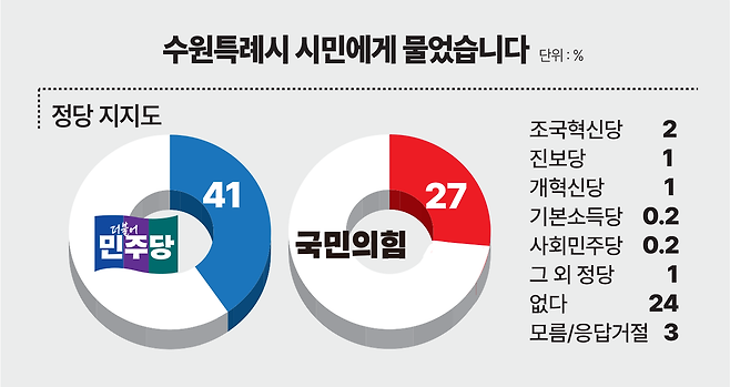 6일 중부일보가 여론조사 전문기관인 한국갤럽에 의뢰해 지난 4~5일 수원시에 거주하는 만 18세 이상 501명을 대상으로 실시한 수원특례시 지역현안 조사 결과에 따르면 응답자들의 정당 지지도는 민주당이 41%로, 27%를 기록한 국민의힘을 오차범위 밖에서 앞섰다. 이어 조국혁신당 2%, 진보당·개혁신당 각 1% 등으로 조사됐다. 이밖에 '없다' 24%, '모름·응답거절' 3%, '그 외 정당' 1%로 집계됐다.