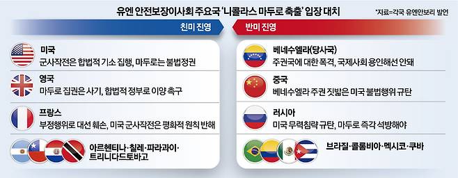 5일(현지시간) 뉴욕 유엔본부에서 열린 유엔 안전보장이사회(안보리) 긴급회의에선 미국의 마두로 전 대통령 체포에 대해 안보리 상임이사국인 미국·영국·프랑스와 중국·러시아 간 극명한 입장차가 드러냈다.