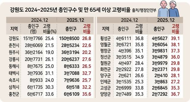 특히 비교적 ‘젊은 도시’로 각인됐던 원주시마저 고령인구 비율이 20%를 넘어서는 등 강원도 내 18개 모든 시·군이 초고령사회에 진입했다.
