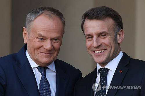 French President Emmanuel Macron, right, welcomes Poland's Prime Minister Donald Tusk before a meeting of the 'Coalition of the Willing' on Ukraine, in Paris, France, Tuesday, Jan. 6, 2026. (AP Photo/Thomas Padilla)