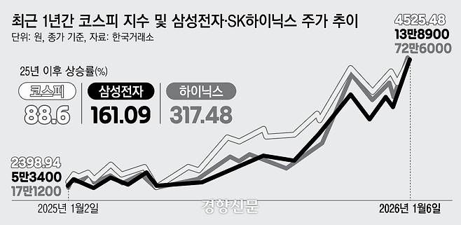 코스피 상승 배경엔 반도체가 있다. 지난해 이재명 정부의 증시부양 정책이 코스피 아래쪽을 받쳐줬고, AI 수혜주인 반도체가 강세를 보이며 코스피 위쪽을 끌어올렸다. 지난해 코스피 시가총액 증가분의 51%가 삼성전자·SK하이닉스의 몫일 정도다.