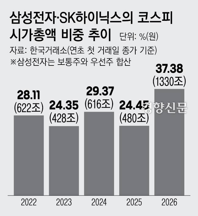 문제는 반도체의 영향력이 커지는 만큼 리스크도 커질 수 있다는 점이다. 6일 삼성전자(우선주 포함)와 SK하이닉스의 시가총액이 코스피에서 차지하는 비중은 38.36%로 역대 최대치를 기록했다. 두 종목의 합산 시가총액 비중은 통상 20%를 웃돌았는데 SK하이닉스가 시가총액이 520조원을 넘길 정도로 급성장한 영향이다.