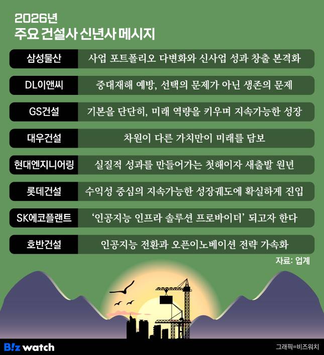 국내 주요 건설사들이 2026년 신년사를 통해 내놓은 메시지는 크게 두가지로 압축된다. 안전경영 등 기본기 강화가 우선 기반이다. 그 위에 더해 인공지능(AI)과 같은 새로운 트렌드를 선점하겠다는 것이다. 지난해 건설현장의 사망사고 여파로 경영진 교체와 사업 중단 사태가 잇따르면서, 중대재해 예방이 최우선 과제로 떠오른 탓이다.