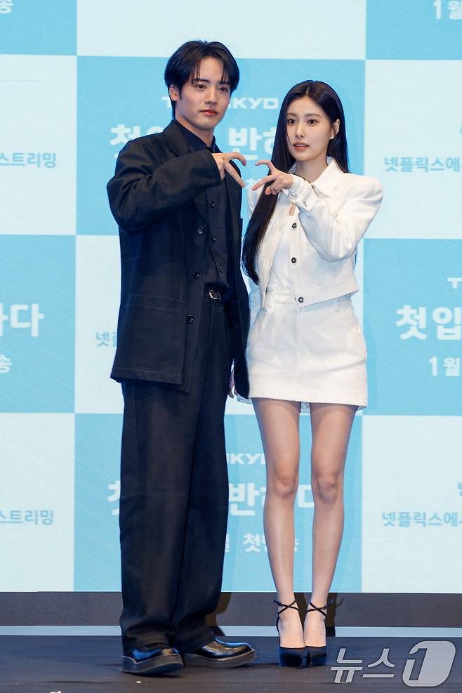 배우 아카소 에이지(赤楚衛二)와 강혜원이 7일 서울 구로구 더세인트에서 열린 일본 테레비 도쿄(TV TOKYO) 드라마 '첫입에 반하다'(김밥과 오니기리, 사랑하는 두 사람은 닮았지만 다르다) 제작발표회에 참석해 포즈를 취하고 있다.