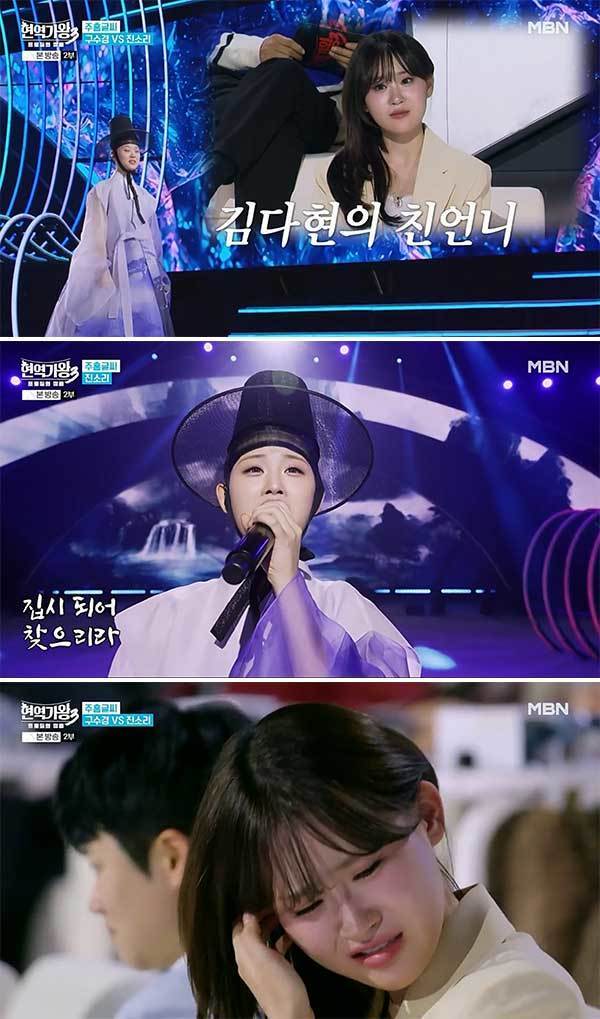 10년차 무명가수 구수경과 벌이는 이번 대결이 더욱 눈길을 끈 점은 진소리의 동생인 가수 김다현이 연예인 판정단으로 출연해 언니의 무대를 지켜봤다는 것이다.