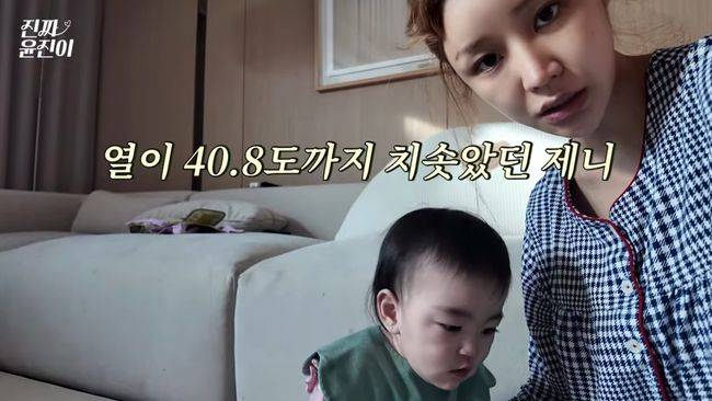 다음날 아침이 되자 다행히 제니는 37.5도로 안정된 모습이었다. 퀭한 얼굴로 카메라를 켠 윤진이는 "제니가 많이 아팠었다. 열이 40.8도까지 치솟았다. 어젠 완전 축 처져있었고 오늘은 그래도 좀 건강을 되찾았다. 하루만에. 지금 저는 세수도 못하고 어제 하루종일 진짜 애기 보느라고. 거의 잠을 못잤던 것 같다"라고 고충을 토로했다.