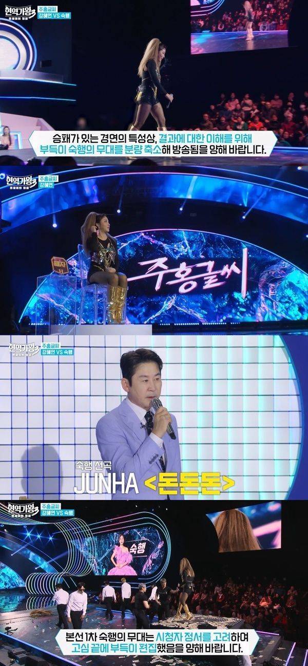 곧 숙행은 '현역 17년차'라는 소개 자막과 함께 경연 단상에 올랐다. 이때 제작진은 "승패가 있는 경연의 특성상, 결과에 대한 이해를 위해 부득이 숙행의 무대를 분량 축소해 방송됨을 양해 바란다"는 사실을 고지했다.