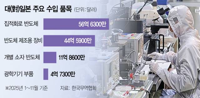 실제로 우리나라가 일본으로부터 수입하는 주요 품목 대부분에는 전기차·반도체 등 제조에 필수적인 희토류가 포함돼 있다. 한국무역협회에 따르면 지난해 1~11월 기준 집적회로 반도체와 반도체 제조용 장비의 대일 수입액은 각각 56억 6300만 달러, 44억 5900만 달러로 대일 수입액 상위 1·2위를 차지했다. 광학기기 부품(4억 7300만 달러), 기타 정밀화학제품(4억 6200만 달러), 자동차 부품(3억 8000만 달러) 등도 수입액 상위 25위에 포함됐다.