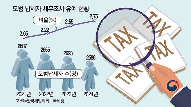 7일 매일경제가 입수한 한국세법학회의 '모범 납세자 우대 혜택의 실효성 검증' 연구용역 보고서에 따르면 2024년 기준으로 모범 납세자 중 세무조사를 유예받은 비율은 2.75%로 집계됐다.