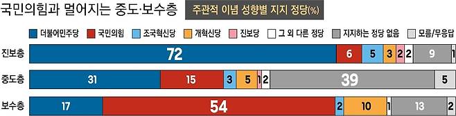 중도층의 31%는 더불어민주당을 지지하고 중도층의 15%는 국민의힘을 지지하는 것으로 나타났다. 진보층의 민주당 지지도는 72%인 반면, 보수층의 국민의힘 지지도는 54%로 상대적으로 낮았다. 중도·보수층이 국민의힘과 멀어지는 추세가 이어지면서 5개월여 앞으로 다가온 6·3 지방선거에도 영향을 미칠 수 있다는 전망이 나온다.