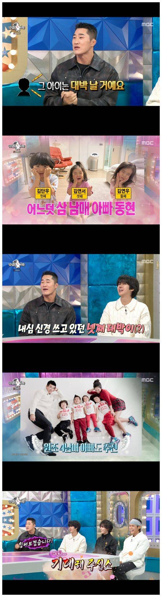 김동현은 “제가 사주 보는 걸 좋아한다. 사주 보는 데서 제가 올해 아이를 낳으면 넷째가 정말 대단해질 거라고 하더라. 그런데 말띠 출산이 얼마 안 남으니까, 와이프가 초조해하더라”라면서 “너무 힘들긴 한데, 둘보다 셋은 더 좋더라. 션이 네 명 있으면 정말 좋다고 하더라. 기대해달라. 힘써 보겠다. 그때 또 인사드리겠다”라고 말했다.