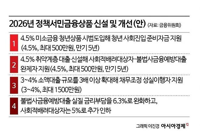 금융 취약계층을 위한 생계자금 대출도 신설한다. 연소득 3500만원 이하 또는 개인신용평점 하위 20% 이하의 사회적 배려 대상자 및 불법사금융예방대출 완제자 등이 대상이다. 이들은 연 4.5%로 최대 500만원까지 대출이 가능하다.