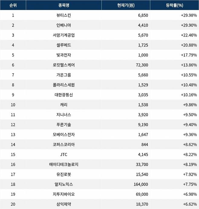 6위 로킷헬스케어(376900)는 현재가 7만 2300원으로 13.86% 급등 중이다. 7위 가온그룹(078890)은 현재가 5660원으로 10.55% 상승 중이다. 8위 폴라리스세원(234100)은 현재가 1529원으로 10.48% 상승 중이다. 9위 대한광통신(010170)은 현재가 3035원으로 10.16% 상승 중이다. 10위 캐리(313760)는 현재가 1538원으로 9.86% 상승 중이다.