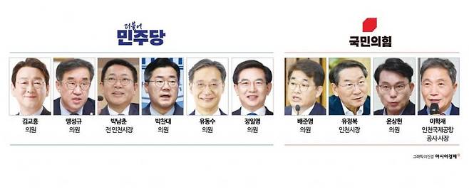 ◇누가 후보자로 거론되나= 인천시장 탈환을 노리는 민주당은 박 전 시장이 재선 도전을 준비한다. 인천국제공항공사 사장을 지낸 정일영 의원(연수구을)도 출마 의사를 밝혔다. 3선 김교흥(서구갑), 맹성규(남동구갑)·유동수(계양구갑) 의원 등 인천을 지역구로 둔 중진 의원도 후보군이다. 최대 변수는 다크호스로 꼽히는 민주당 원내대표 출신의 박찬대 의원(연수구갑)의 출마 여부다. 박 의원이 출마한다면 민주당 경선 구도가 달라질 것으로 보인다. 국민의힘은 유 시장을 비롯해 이학재 인천국제공항공사 사장, 5선의 윤상현 의원(동구·미추홀구을), 재선의 배준영 의원(중구·강화군·옹진군) 등이 후보군으로 거론된다.
