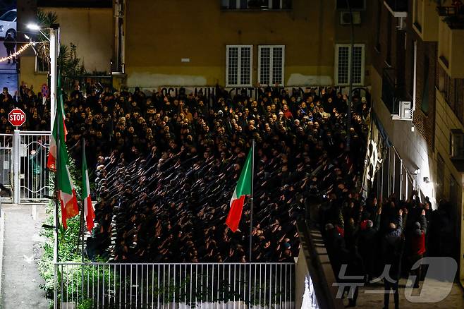 (로마 로이터=뉴스1) 이정환 기자 = 7일(현지시간) 이탈리아 로마에서 네오파시스트들이 1978년 1월 7일 발생한 극우 활동가 2명의 살해 사건을 기리는 아카 라렌티아(Acca Larentia) 기념식에서 손짓을 하고 있다. 2026.01.07.