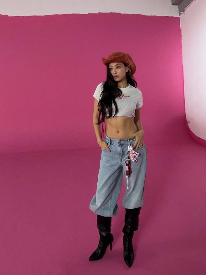 지효는 8 자신의 인스타그램에 여러 장의 사진을 게재하며 화보를 방불케 하는 비주얼을 선보였다. 공개된 사진 속 지효는 강렬한 핑크 배경 앞에서 크롭 티셔츠와 루즈한 데님 팬츠를 매치해 과감하면서도 트렌디한 스타일링을 완성했다.