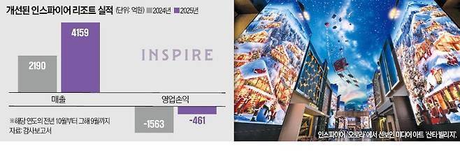 8일 금융감독원 전자공시에 따르면 인스파이어의 지난해(2024년 10월~2025년 9월) 매출은 4159억원으로 전년(2190억원) 대비 90% 급증했다. 수익성도 크게 개선됐다. 영업적자는 1563억원에서 461억원으로 3분의 1 수준으로 줄었다. 당기순손실도 2654억원에서 1548억원으로 1000억원 이상 덜어냈다. 법인세·이자·감가상각비 차감 전 영업이익(EBITDA)은 169억원으로 흑자 전환했다.