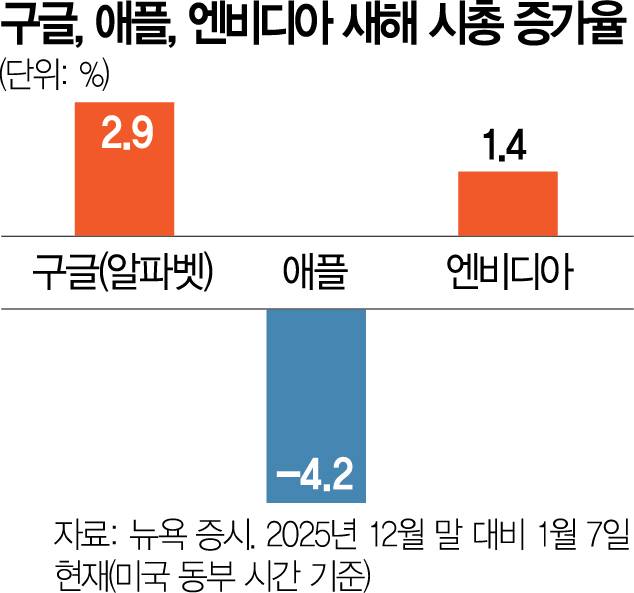 AI 거품론이 이어지는 상황에서도 알파벳은 지난해 한 해 동안 주가가 66.0%나 치솟으며 39.3% 오른 엔비디아의 수익률을 압도했다. 이에 반해 애플은 지난해 상승장에서도 8.5%밖에 오르지 못해 나스닥종합지수 전체 수익률(20.4%)조차 따라가지 못했다.