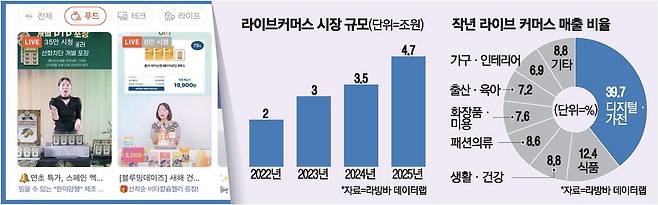 8일 커머스분석업체 라방바 데이터랩에 따르면 2025년 국내 라이브커머스 시장 규모는 4조7000억원으로 전년 대비 35%나 성장했다. 2022년 2조원, 2023년 3조원, 2024년 3조5000억원을 기록하는 등 빠른 성장세가 이어지고 있다.