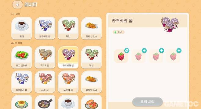 가령 블루베리 4개를 그냥 판매하면 64골드지만 블루베리 4개로 블루베리 잼을 만들면 170골드를 받는다. 토마토 2개로 만드는 베지 샐러드도 동일하다. 게다가 그냥 과일을 주워 먹는 것보다 스태미나도 더 많이 회복할 수 있다. 골드를 버는 용도라면 마시모에게 커피 원두를 사서 만드는 커피가 꽤 쏠쏠하다.