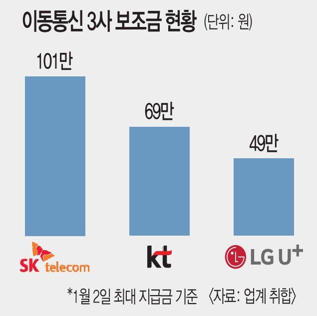 8일 국민일보가 입수한 이동통신사별 보조금 지급 계획안에 따르면 SK텔레콤은 지난 2일 기준 10만9000원짜리 5G 프리미엄 요금제 판매 건에 대해 최고 101만원의 보조금을 지급하고 있다. 단말기에 따라 보조금 규모가 다르지만, 인기 프리미엄 기종을 보면 101만원(갤럭시 Z플립7)·97만원(갤럭시 Z폴드7)·94만원(갤럭시 S25 울트라) 등 100만원 안팎을 유지했다. LG유플러스도 일부 판매점에 대해 비슷한 수준의 보조금 정책을 책정한 것으로 전해졌다.