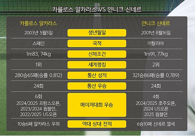 지난 2년간 4대 메이저대회 우승 트로피의 향방만 봐도 이제 빅2의 시대임을 명확히 알 수 있다. 알카라스와 신네르는 8개의 트로피를 정확히 4개씩 양분했다. 알카라스가 2024년 프랑스오픈과 윔블던, 지난해 프랑스오픈과 US오픈을 휩쓸었고, 신네르는 2024년 호주오픈과 US오픈, 2025년 호주오픈과 윔블던에서 정상에 올랐다. 반면 조코비치는 2024년 윔블던 준우승을 빼면 결승 무대에 오르지도 못했다. 심지어 지난해엔 4대 메이저대회에서 모두 4강에 올라 프랑스오픈과 윔블던은 신네르에게, US오픈은 알카라스에게 무릎을 꿇었다. 남자 테니스의 완벽한 세대교체를 보여주는 장면이었다.
