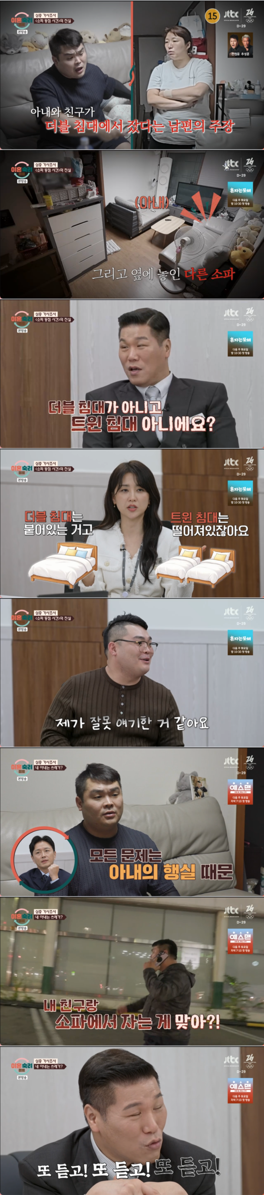 그러나 남편의 주장은 사실과 달랐다. 남편이 '더블 침대' 같다고 주장했던 소파는 실제로는 트윈 형태로 나눠진 소파였던 것. 남편의 억지 논리와 반복되는 비난에 MC 서장훈은 결국 폭발했다. 서장훈은 "지겨워 죽겠네! 하루 종일 했던 얘기를 또 듣고! 또 듣고! 또 듣고!"라며 분노를 참지 못했다.