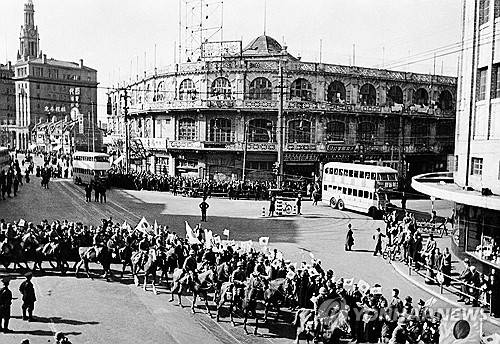 FILE - When 5,000 Japanese soldiers took part in a victory parade through the international settlement in Shanghai, China, on Dec. 3, 1937, with machine guns and artillery, a Chinese person threw a hand-grenade at the marching throng, and several Japanese were injured. Japanese cavalry swings into Nanking Road with banners flying. Just after this stage the hand grenade was thrown, causing confusion among the marching troops. (AP Photo, File) FILE PHOTO 01595