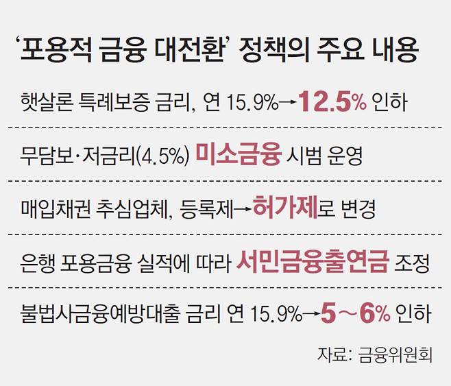 금융위는 은행권의 서민 대출상품인 새희망홀씨 공급 규모를 올해 4조 원에서 2028년 6조 원까지 단계적으로 늘릴 방침이다. 인터넷전문은행의 중저신용자 신용대출 비중(신규 취급액 기준)도 올해 30%에서 2028년 35%까지 높인다. 불법사금융예방대출(옛 소액생계비대출)의 금리도 기존 15.9%에서 5∼6%대로 완화한다.