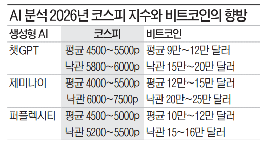 8일 3개의 AI 생성형 모델 챗GPT·제미나이·퍼플렉시티 분석 결과, 2026년 코스피 지수는 5000p를 넘어 긍정적인 흐름이 지속될 것이라는 전망이 우세했다. 일부 낙관적인 전망 수치는 6000p를 넘어 7000p까지 돌파가 가능하다는 분석이다.