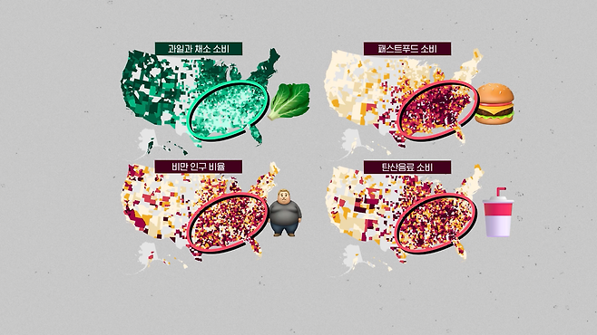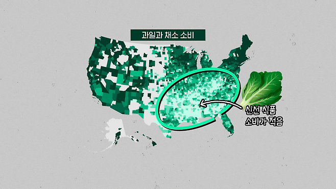 먼저 과일과 채소의 소비 정도를 나타내보면 이렇습니다. 색이 연하면 연할수록 신선 식품의 소비량이 적다는 건데, 이 지역들 대부분 1인당 GDP가 낮은 동네들입니다. 대표적으로 저소득층이 많이 사는 미시시피, 켄터키 같은 지역이죠.