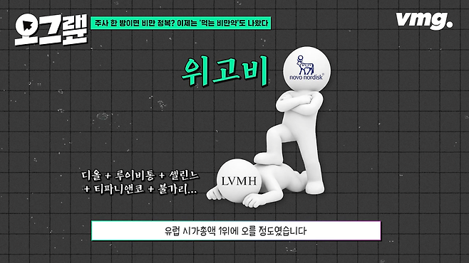 2021년 미국 FDA 승인을 받은 이후 위고비는 헐리우드 중심으로 폭발적으로 유행하면서 말 그대로 대박이 납니다. 국내엔 일론 머스크가 사용한 비만약으로 알려지기도 했고요. 2023년 9월엔 노보 노디스크가 프랑스의 명품 제국 LVMH를 제치고 유럽 시가총액 1위에 오를 정도였어요.