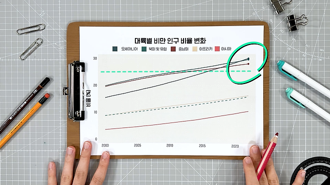 2022년 기준으로 아메리카, 유럽, 오세아니아 지역에서는 성인 4명 중 1명이 비만일 정도죠. 이러한 추세가 이어진다면 2050년에는 전 세계 인구 중 38억 명이 비만이 될 거라는 연구 결과도 있습니다. 비율로 따져보면 성인 2명 중 1명은 과체중 아니면 비만인 겁니다.